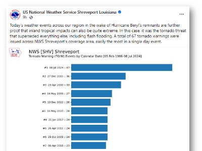 Beryl’s arrival into the ArkLaTex region fueled a warm and unstable atmosphere and churned more than 67 active tornado warnings, a National Weather Service record, across the area, with many in SWEPCO’s service territory.