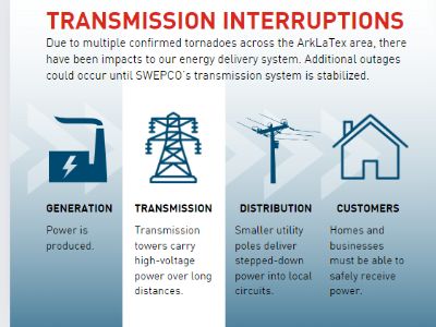 As a result of the significant impacts, additional outages could occur until SWEPCO’s transmission system is stabilized. Customers should prepare to be without service for an extended period.